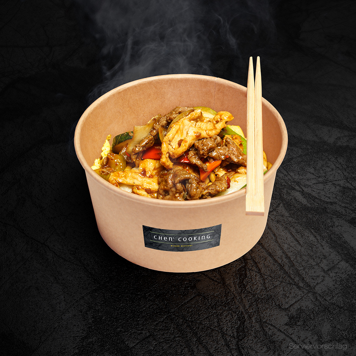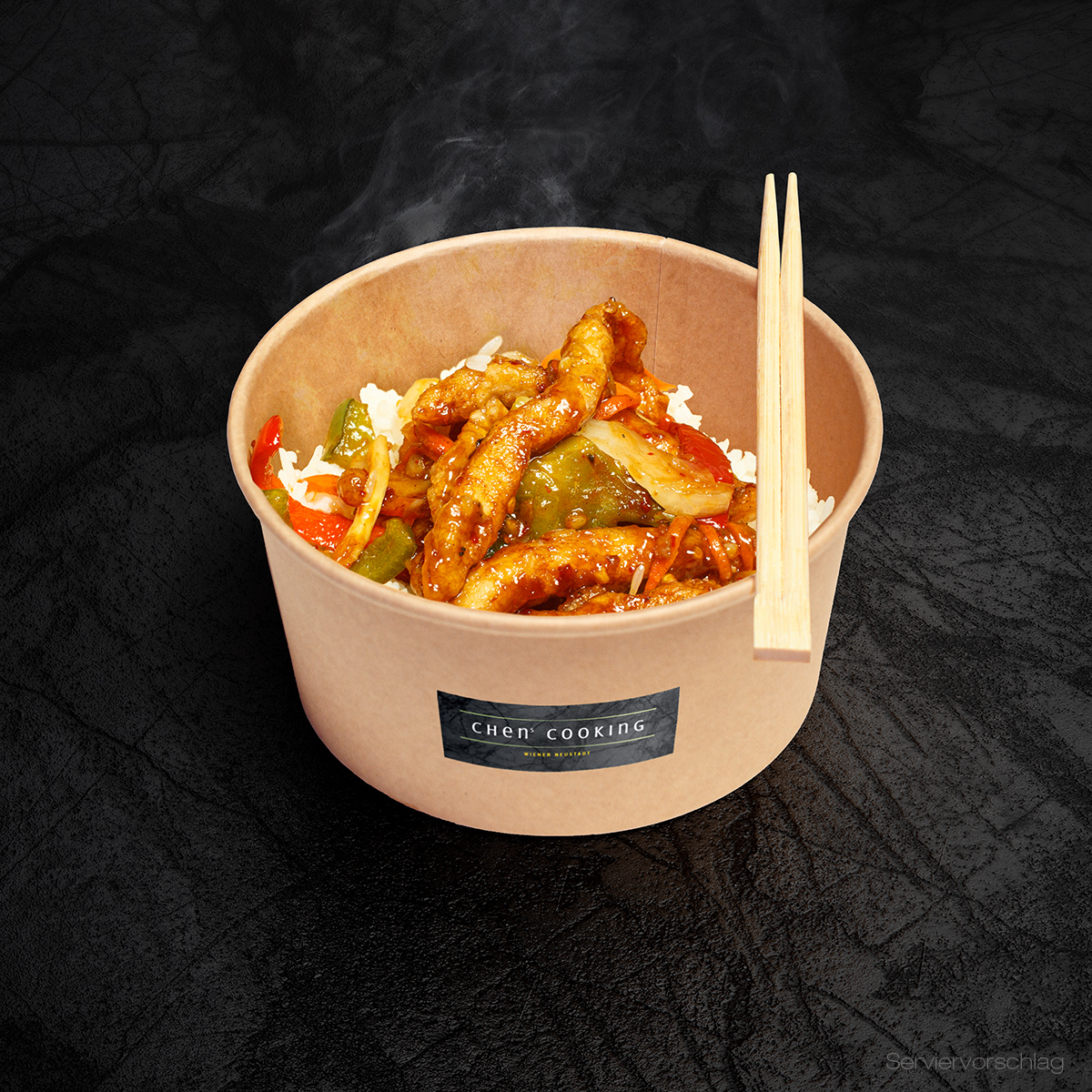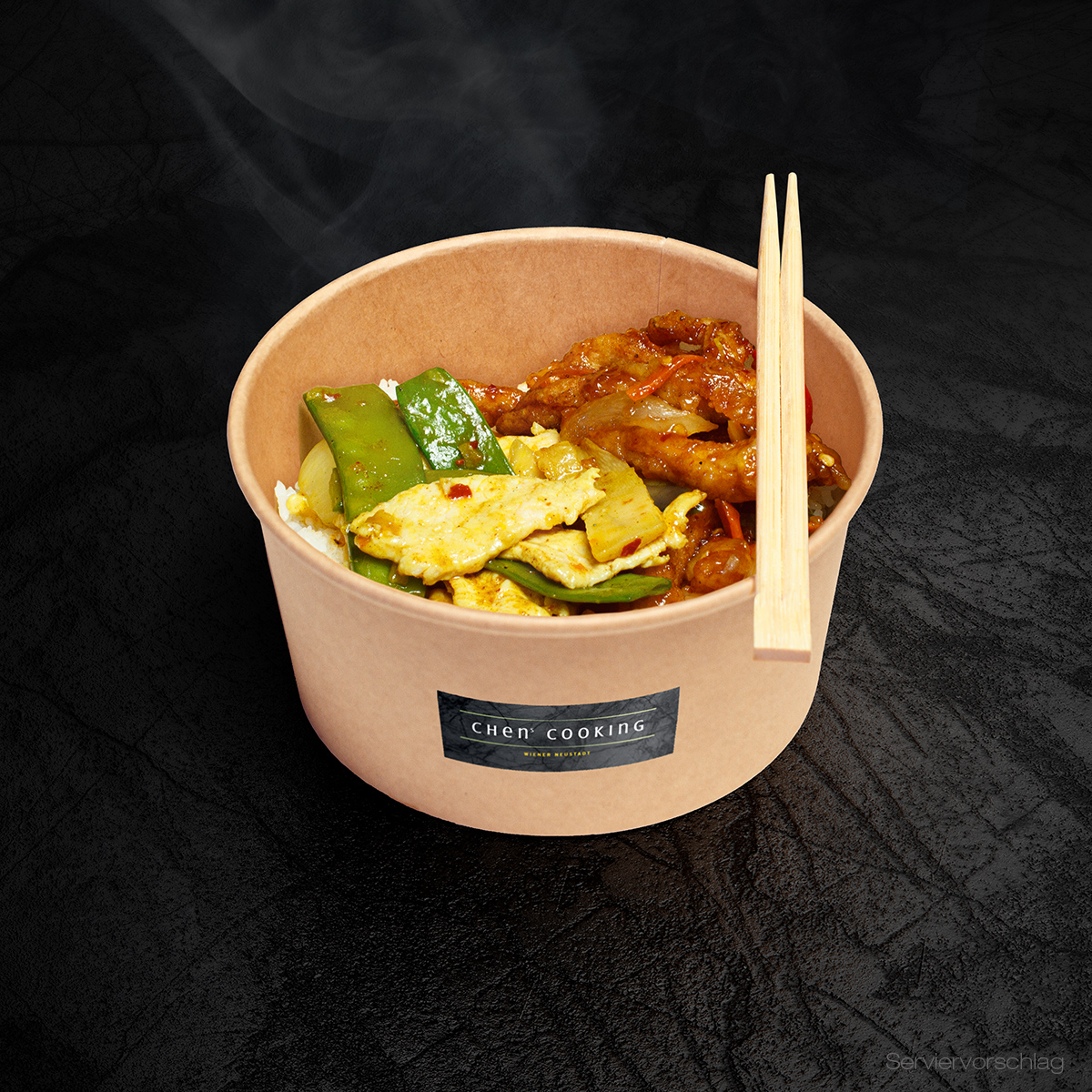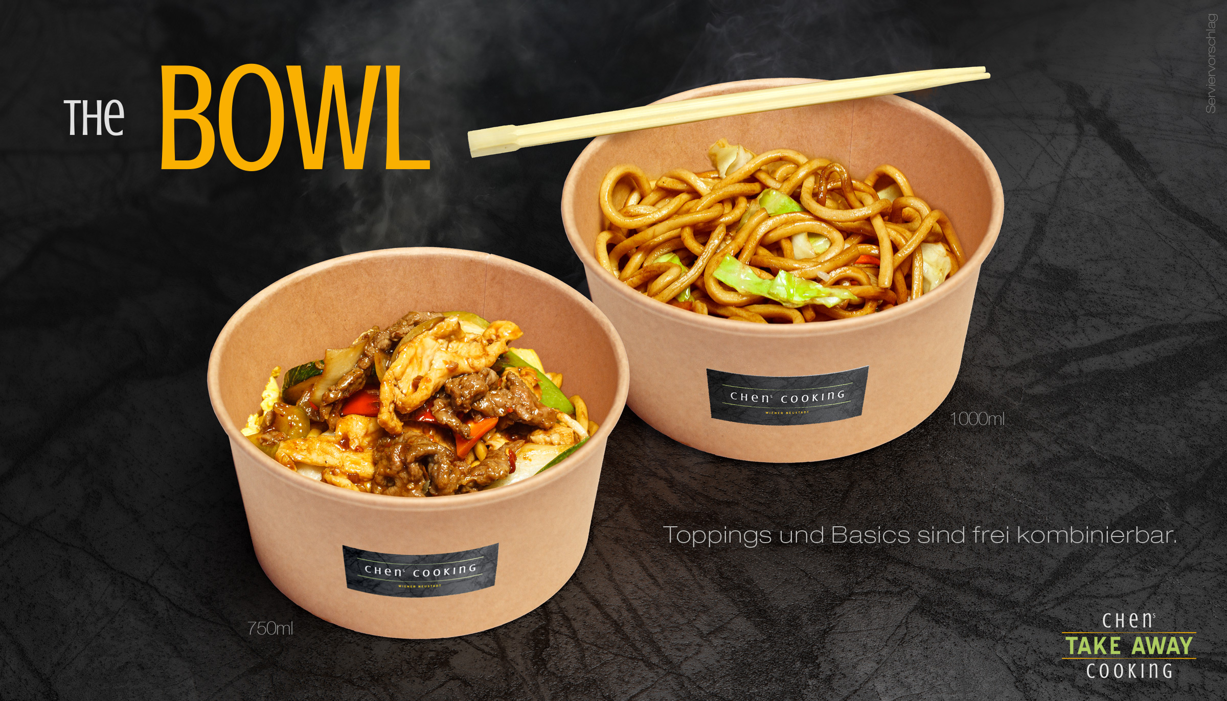 The BOWL gibt es in zwei Größen mit 750ml oder 1000ml und mit bis zu zwei Toppings nach Wahl. Als Grundlage stehen die Basics: Jasmin Reis, gebratener Eierreis oder gebratene Nudeln zu Auswahl.